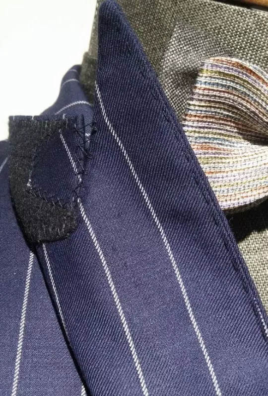 工藝分幾個(gè)級(jí)別,粘合襯、半麻襯、全麻襯。是否是手工鎖眼;是否對(duì)格對(duì)條;是否手工納駁頭(西裝領(lǐng))。